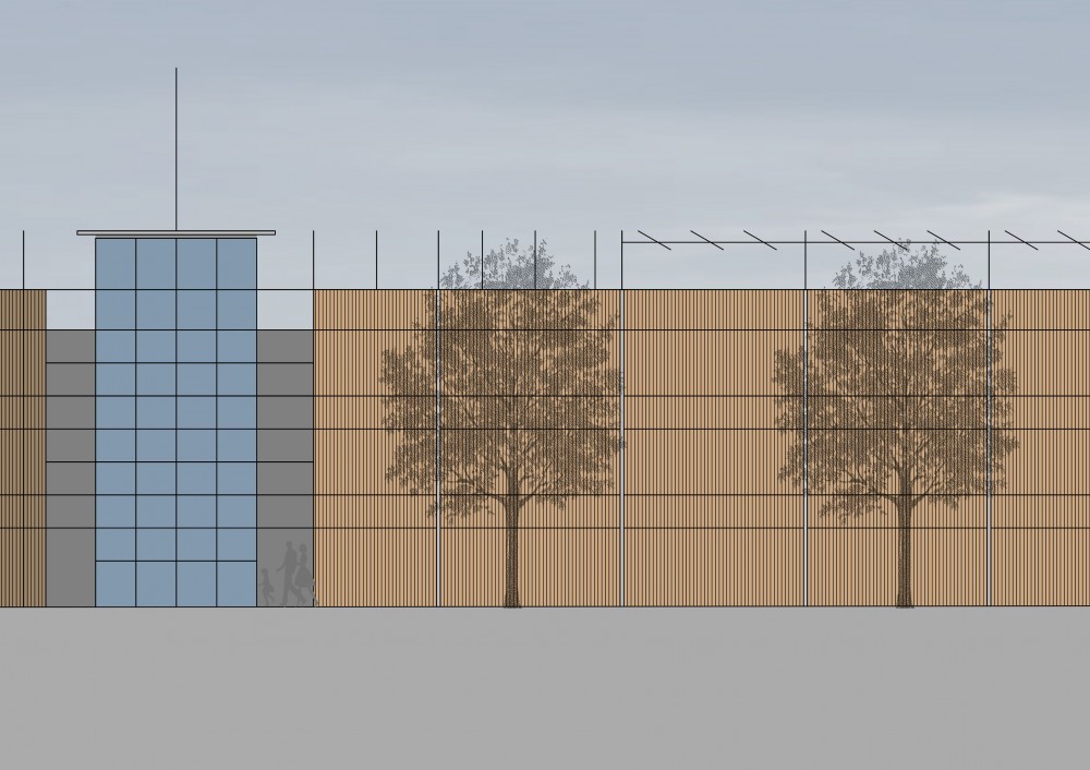 Stahlkonstruktion mit Stahlbetonplatten als Verbundkonstruktion. Fassenflächen aus Lärchenholzkanthölzern mit Fugenanteil zu Querlüftung.