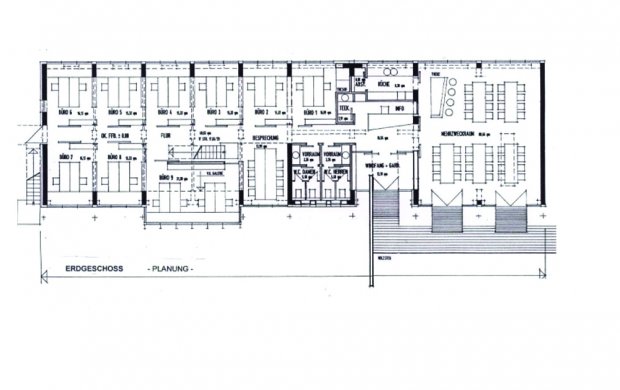 Neben den Büros und einer Bibliothek sollte ein Mehrzweckraum vorgesehen werden, der auch als separater Gemeinschaftsraum für die Dorfgesellschaft genutzt werden kann.
