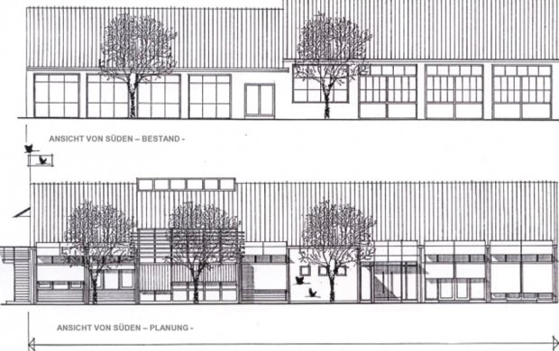 Planung für den Umbau eines Werk- und Garagengebäudes einer LPG zu einem Büro- und Vereinsgebäudes für den Landschafts-Förderverein Nutze-Nieplitz-Niederung in Stücken bei Potsdam.